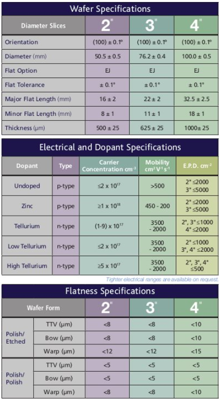 Specs for Gallium Antimonide (GaSb) Semiconductor Wafers: