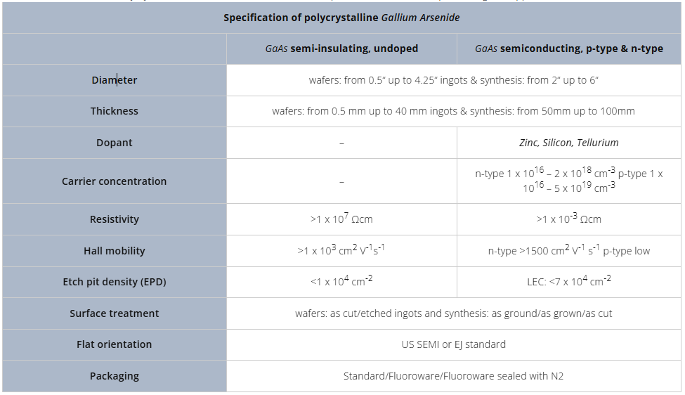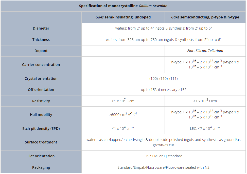 Specs for Gallium Arsenide (GaAs) Semiconductor Wafers: